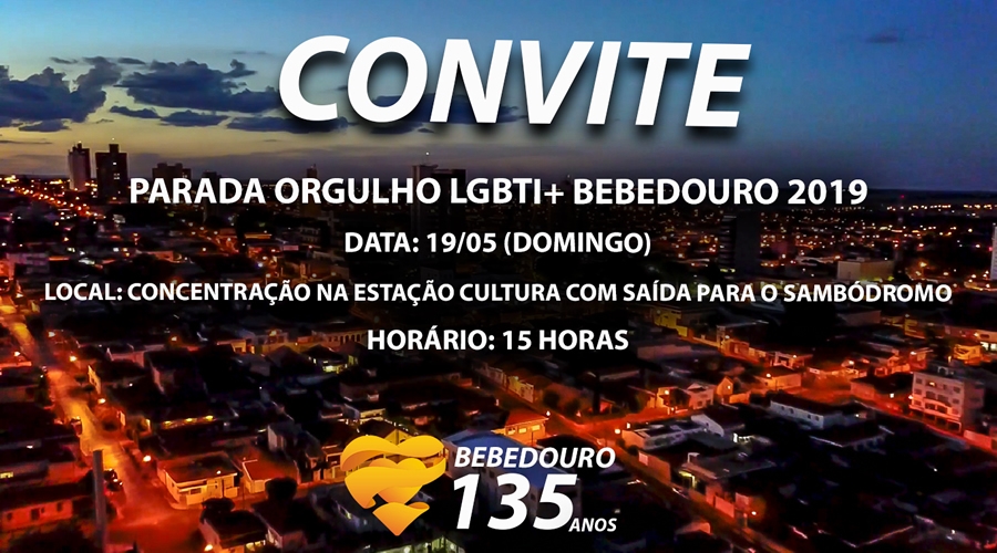 Será realizada neste domingo(19/05), a 9ª edição da Parada do Orgulho LGBTI+ Bebedouro 2019, com o tema “Uma nova cidade se faz sem preconceito”. O evento que faz parte da comemoração do aniversário de 135 anos do município, será realizado no domingo (19/05), a partir das 14h.