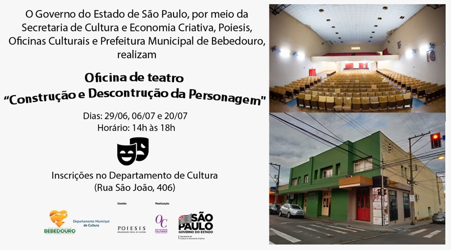 A Prefeitura de Bebedouro, através do Governo do Estado de São Paulo, Secretaria de Cultura e Economia Criativa, Poiesis e Oficinas Culturais, realiza a Oficina de Teatro “Construção e Descontrução da Personagem”, sob a coordenação da diretora, atriz, bailarina, cantora e dramaturga, Elaine Oliveira. Elaine é também arte-educadora em Teatro nas Oficinas Culturais de Araraquara, diretora artística e produtora da Allegria Cia de Teatro.