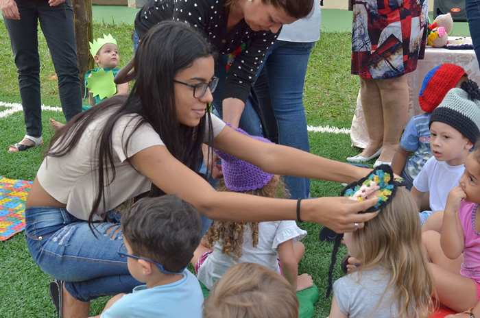 A primeira dama e presidente do Fundo Social, Aline Galvão acompanhou a entrega dos gorros para as crianças das escolas municipais
