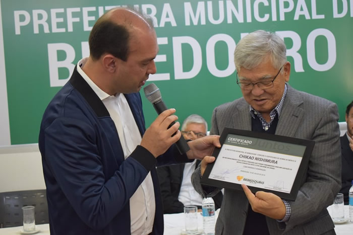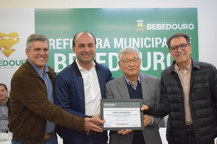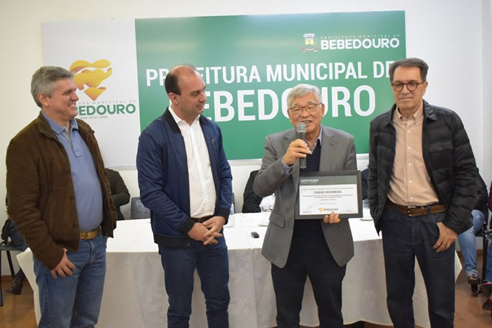 A Prefeitura de Bebedouro realizou a entrega do certificado de Honra ao Mérito ao empresário membro do Conselho Curador da Fundação Shunji Nishimura de Tecnologia, Chikao Nishimura, na quarta-feira (10/07), entregue pelo prefeito Fernando Galvão.