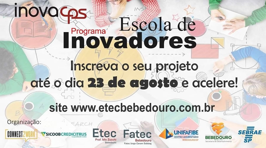 A ETEC finalizará nesta sexta-feira (23/08), as inscrições do Programa Escola de Inovadores. Para a segunda edição do evento outros parceiros reforçam esse time, entre eles, a Prefeitura de Bebedouro, através do Banco do Povo, FATEC e a empresa Connect2work.