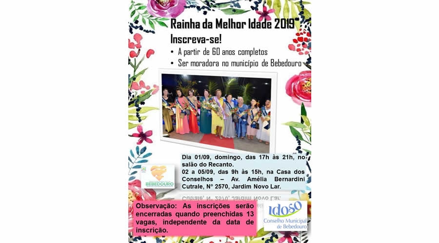 A Prefeitura de Bebedouro através do Conselho Municipal do Idoso abre inscrições para o concurso da Rainha da Melhor Idade 2019, de 01 a 05 de setembro.
