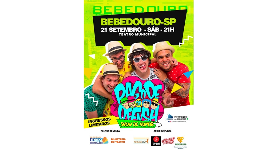 A Prefeitura de Bebedouro, por meio do Departamento Municipal de Cultura e Eventos, através do Teatro Municipal "Maurício Alves de Oliveira Júnior", apresentará no sábado (21/09), a partir das 20h, o Show de Humor “Pagode da Ofensa”.