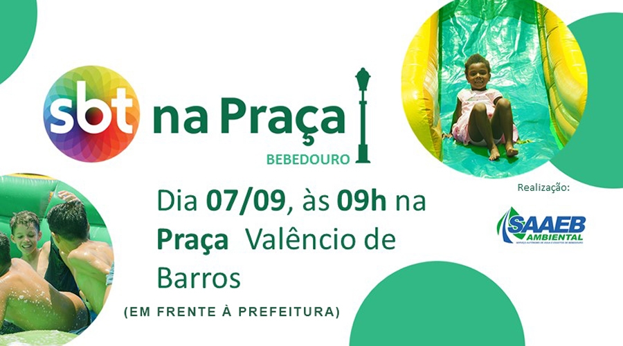 O SBT em parceria com o Sistema Autônomo de Água e Esgoto de Bebedouro (SAAEB) realizará no sábado (07/09), das 9h às 13h, o evento “SBT na Praça”. O evento tem como objetivo conscientizar a população a respeito do uso consciente da água, oferecendo serviços como, renegociação de dívida, atualização de cadastros e 2ª via de conta, informações e demonstração da conta de água, assistência social para isenção de aposentados, divulgação do APP do SAAEB, e demonstração do projeto Água Viva, além de informações sobre o sistema de tratamento de água e esgoto. A população terá ainda atividades recreativas grátis como corte de cabelo, pintura facial, brinquedos, pipoca e algodão doce.