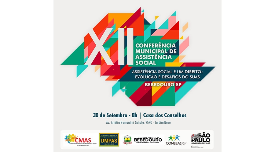 A Prefeitura Municipal de Bebedouro, por meio do Departamento Municipal de Promoção e Assistência Social (DMPAS), e o Conselho Municipal de Assistência Social, convidam a participar da 12ª Conferência Municipal de Assistência Social, que será realizada na segunda-feira (30/09), às 8h, na Casa dos Conselhos.
