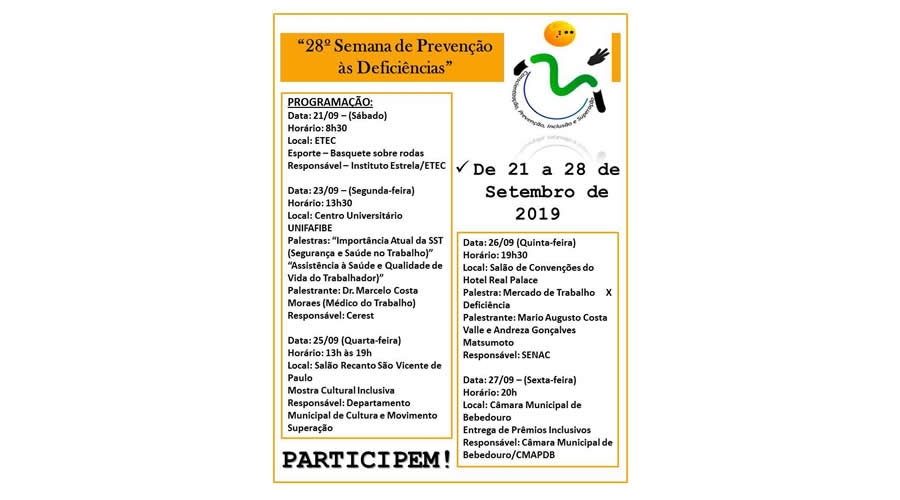 A semana terá continuidade na segunda-feira (23/09), no Centro Universitário Unifafibe, quarta-feira (25/09), no salão de festas do Recanto São Vicente de Paulo, quinta-feira (26/09), no salão de convenções do Hotel Real Palace e na sexta-feira (27/09), na Câmara Municipal de Bebedouro.
