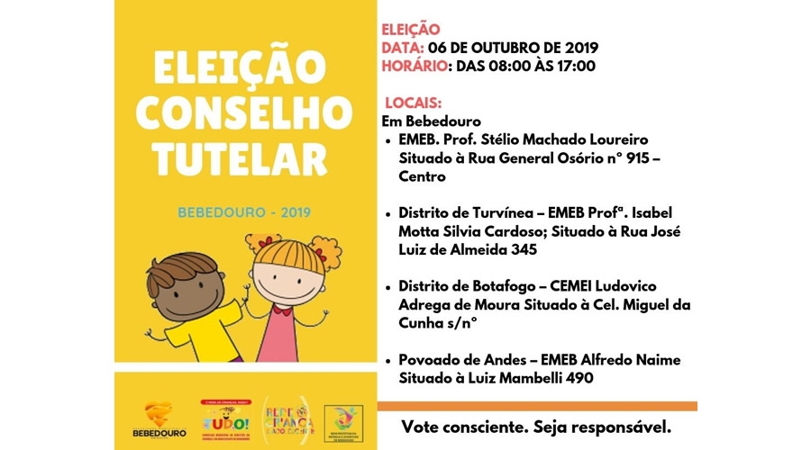 O Conselho Tutelar realizará nova eleição para a escolha de novos conselheiros. A eleição será realizada no domingo (06/10), das 8h às 17h, nas EMEBs Professor Stélio Machado Loureiro, Professora Isabel Motta Silvia Cardoso (Distrito de Turvínia), Alfredo Naime (Povoado de Andes) e CEMEI Ludovico Adrega de Moura.
