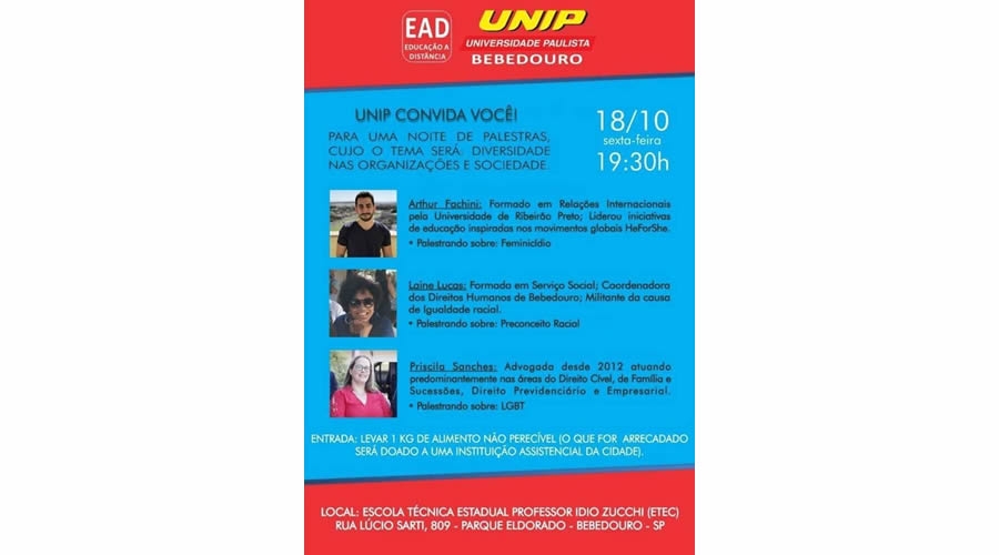 Serão abordados assuntos sobre “Diversidades nas Organizações e Sociedade”. Também irão palestrar o formando em Relações Internacionais, Arthur Fachini e a advogada, Priscila Sanches.