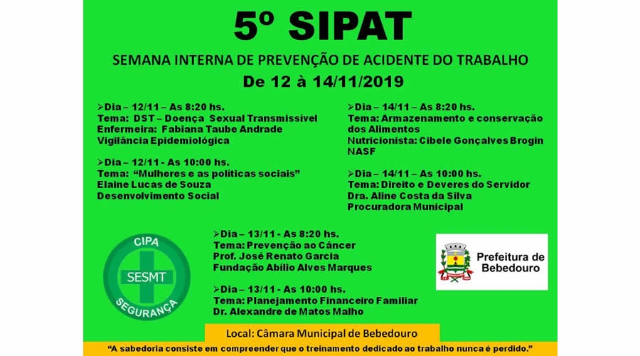 O Serviço Especializado em Engenharia de Segurança e Medicina do Trabalho (SESMT), em parceria com a Prefeitura de Bebedouro, realizará entre os dias 12 e 14 de novembro a 5ª edição da SIPAT (Semana Interna de Prevenção de Acidentes do Trabalho). O evento será realizado a partir das 8h20, na Câmara Municipal de Bebedouro.