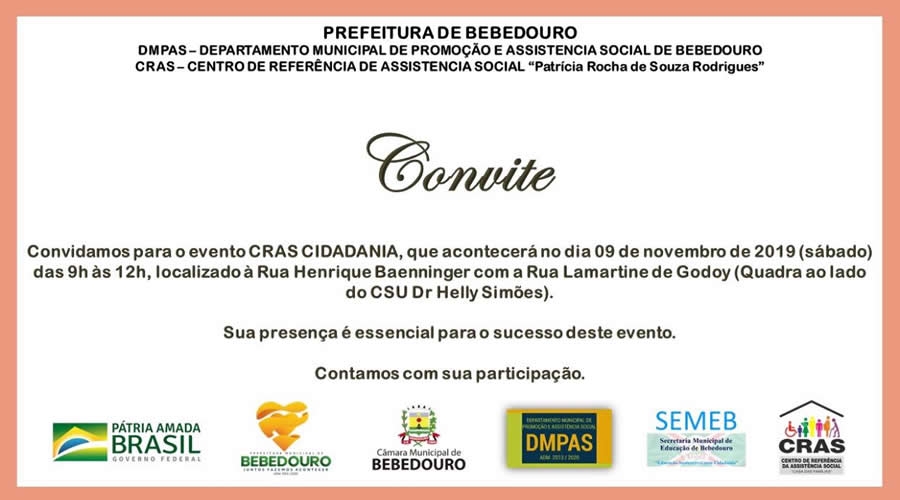 A Prefeitura de Bebedouro, por meio do Departamento Municipal de Promoção e Assistência Social, através do CRAS Sul (Centro de Referência de Assistência Social), “Patrícia Rocha de Souza Rodrigues”, realizará a 5ª edição do CRAS Cidadania, no sábado (09/11), das 9h às 12h, na Rua Lamartine de Godoy (ao lado da quadra do Centro Social Urbano Dr. Helly Simões).