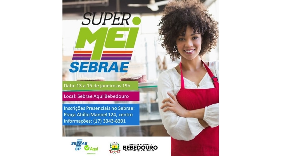 O SEBRAE Aqui realizará gratuitamente o curso Super MEI, nos dias 13 e 15 de janeiro, às 19h, na sede do SEBRAE Aqui, localizada na Praça Abílio Manoel, nº124, centro.