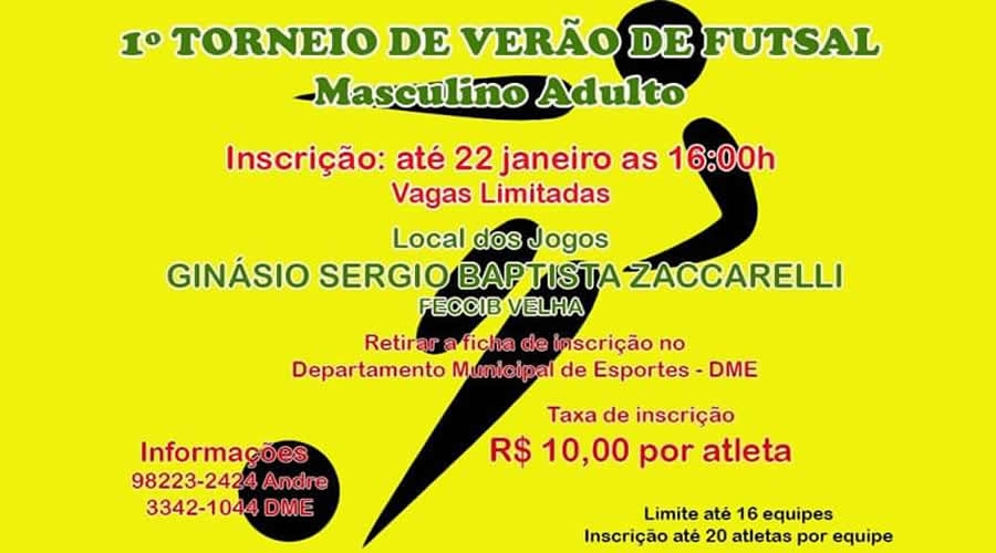 Estão abertas inscrições para o “1º Torneio de Verão de Futsal Masculino Adulto”, que será realizado no Ginásio Municipal de Esportes “Sérgio Baptista Zaccarelli”. Os interessados devem entregar a ficha de inscrição na secretaria do DME, até quarta-feira (22/01), às 16h.
