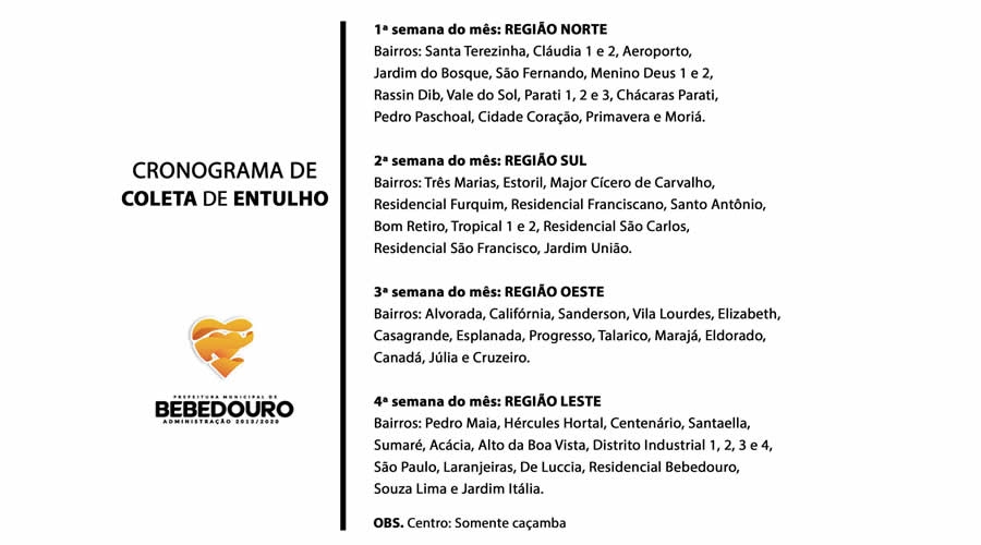 1ª semana do mês: REGIÃO NORTEBairros: Santa Terezinha, Claudia 1 e 2, Aeroporto, Jardim do Bosque, São Fernando, Menino Deus 1 e 2, Rassin Dib, Vale do Sol, Parati 1, 2 e 3, Chácaras Parati, Pedro Paschoal e Cidade Coração.