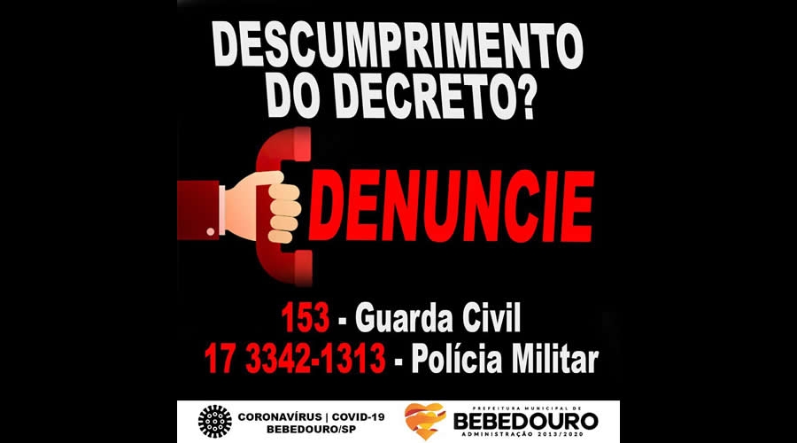 O Gabinete de Gestão Integrada, através da Defesa Civil de Bebedouro e Guarda Civil Municipal (GCM), solicitam que a população utilize o disk denúncia 153, para denúncias sobre estabelecimentos comerciais que estejam desrespeitando o decreto municipal nº 14.052 de 20 de março de 2020, assinado pelo prefeito Fernando Galvão, em relação às medidas de prevenção ao novo Coronavírus.