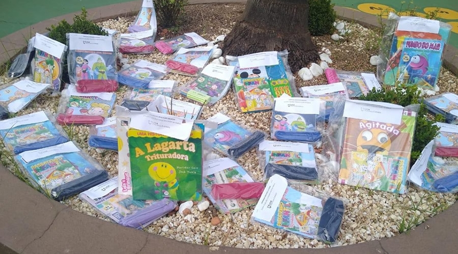 No ano passado, foram entregues aproximadamente 230 estojos para alunos do 1◦,2◦ e 3◦ ano do ensino fundamental da EMEB João Pereira Pinho.