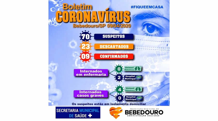 A Prefeitura de Bebedouro através da Vigilância Epidemiológica informa que na quinta-feira (09/04), o município apresenta 70 casos suspeitos do novo Coronavírus, sendo 09 confirmados.