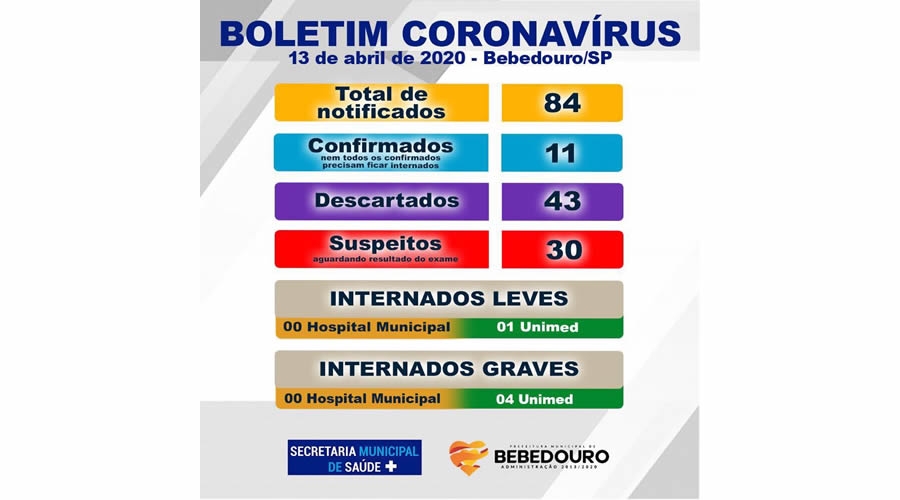 A Prefeitura de Bebedouro, por meio da Secretaria Municipal de Saúde, informa que até a segunda-feira (13/04), o município conta com 11 casos positivos de Covid-19.
