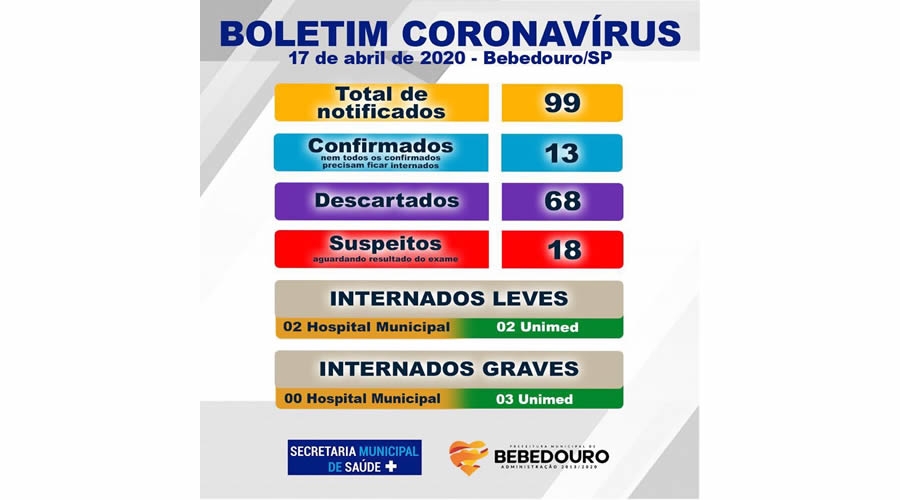 A Prefeitura de Bebedouro, por meio da Secretaria Municipal de Saúde, informa que até a sexta-feira (17/04), o município conta com 13 casos positivos de Covid-19.