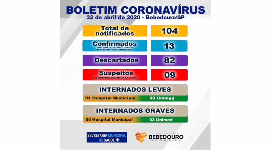 A Prefeitura de Bebedouro, por meio da Secretaria Municipal de Saúde, informa que até a quarta-feira (22/04), o município conta com 13 casos positivos de Covid-19.