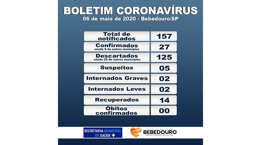 A Prefeitura de Bebedouro, por meio da Secretaria Municipal de Saúde, informa que nesta quarta-feira (06/05), o município conta com 27 casos positivos de Covid-19.