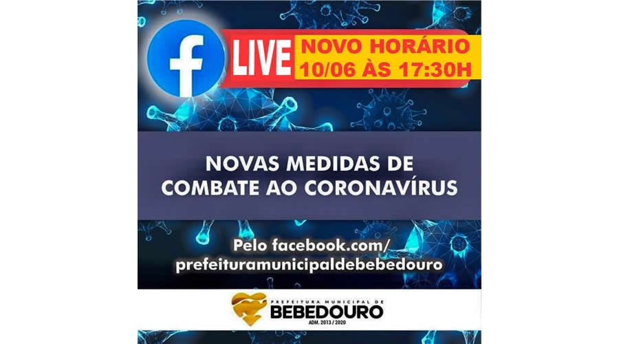 O prefeito Fernando Galvão, realizará nesta quarta-feira (10/06), o anúncio de novas medidas de combate ao Coronavírus, em novo horário às 17h30, e exibido ao vivo na página da Prefeitura de Bebedouro, através da rede social Facebook.