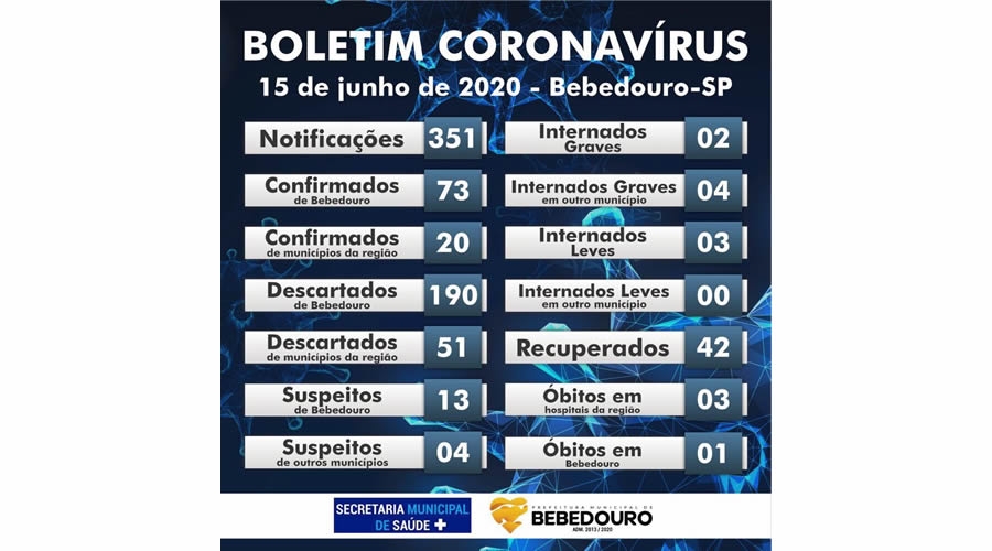 A Prefeitura de Bebedouro, por meio da Secretaria Municipal de Saúde, informa que até segunda-feira (15/06), o município registrou 73 casos positivos de Bebedouro, e 20 de outros municípios, totalizando 93 casos.