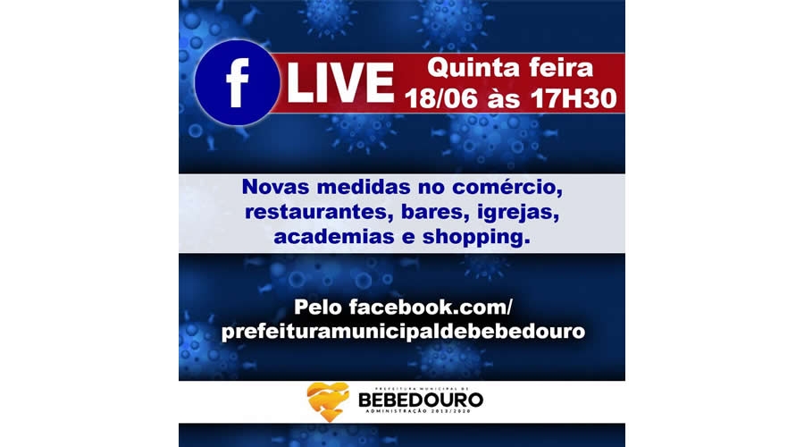 O prefeito Fernando Galvão, realizará nesta quinta-feira (18/06), o anúncio de novas medidas de combate ao Coronavírus, relacionadas ao comércio, restaurantes, bares, igrejas, academias e shopping. O anúncio será realizado às 17h30, através de uma live, e exibido ao vivo na página da Prefeitura de Bebedouro, através do Facebook.