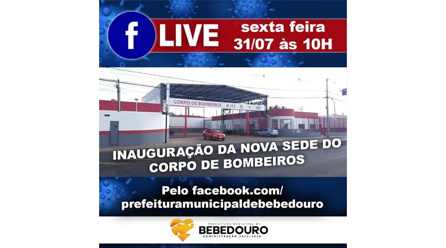A Prefeitura de Bebedouro, realizará na sexta-feira (31/07), a inauguração da nova sede do Corpo de Bombeiros de Bebedouro. A cerimônia será realizada às 10h, exibida ao vivo através de uma live, na página da Prefeitura, pelo Facebook, www.facebook.com/prefeituramunicipaldebebedouro