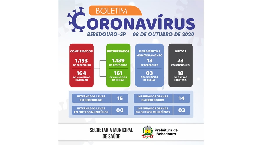 A Prefeitura de Bebedouro, por meio da Secretaria Municipal de Saúde (SMS), informa que até quinta-feira (08/10), o município registrou 1.193 casos positivos de Covid-19, e 164 de municípios da região.