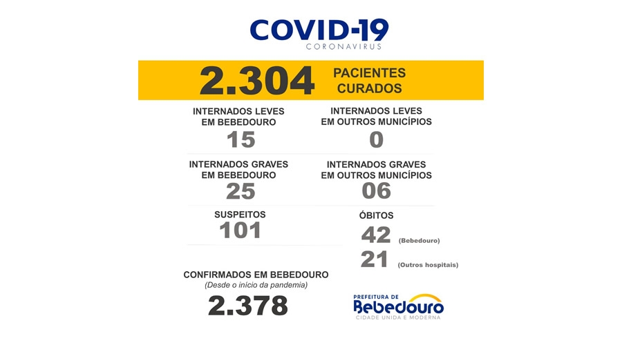 Até o momento, o município contabiliza 2.378 casos confirmados da Covid-19.