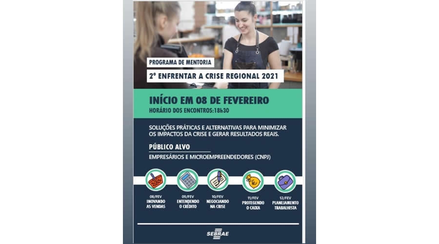 O SEBRAE Barretos está com as inscrições abertas para a segunda edição do programa de mentoria “Enfrentar a Crise Regional 2021”. Os encontros serão realizados de forma online a partir das 18h30, de segunda-feira (08) a sexta-feira (12).