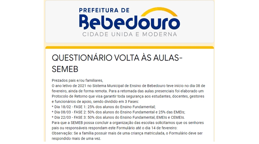 Os pais ou responsáveis pelos alunos das escolas municipais de Bebedouro devem preencher um questionário sobre o retorno dos estudantes para a sala de aula, que acontece a partir do dia 18 de fevereiro. Na fase 1, o retorno é opcional. Os familiares devem preencher o formulário no site https://tinyurl.com/19los17u