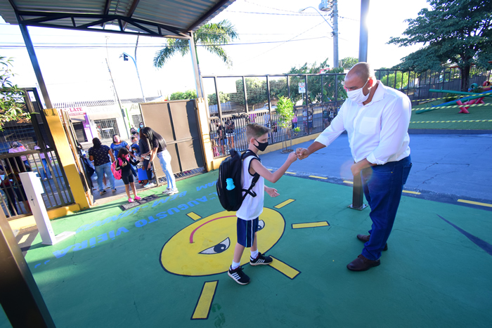 O prefeito Lucas Seren não compareceu por recomendações médicas, mas o secretário de Educação, Hélio Souza, acompanhou o retorno de perto na EMEF Augusto Vieira. “Os alunos foram recebidos em um tapete sanitizante, álcool gel, marcações no chão e aferição de temperatura. A sala de aula foi preparada com muito cuidado, com carteiras espaçadas, álcool gel, alunos e professores com máscaras”, informa.