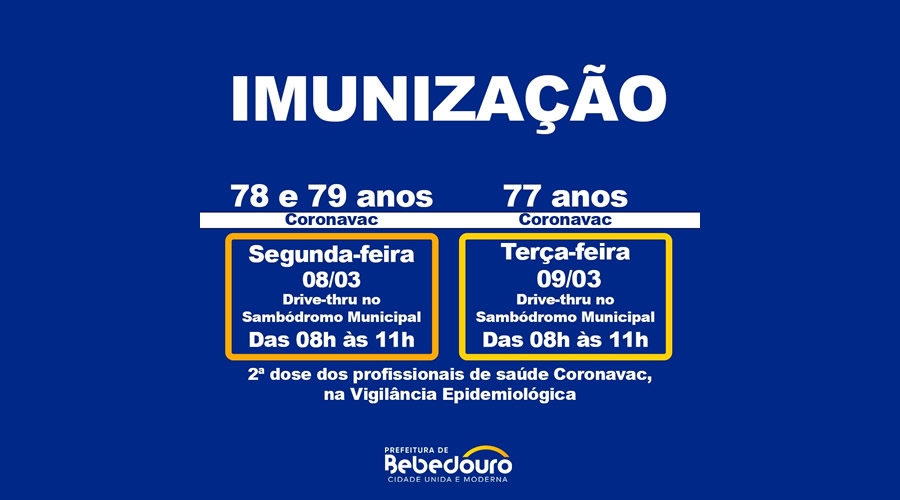 As equipes da Secretaria Municipal de Saúde voltam a vacinar os idosos de Bebedouro de 77 a 79 anos. Serão dois dias de vacinação drive-thru das 08h às 11h – na segunda-feira (08) é a vez das pessoas com 78 e 79 anos e, na terça-feira (09), das com 77 anos. Há vacina para todos e não é necessário chegar mais cedo.