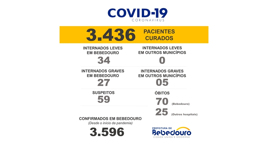 A Prefeitura de Bebedouro informa que foram confirmados 14 curados, 21 negativos e 16 casos positivos do novo coronavírus nesta terça-feira (16).