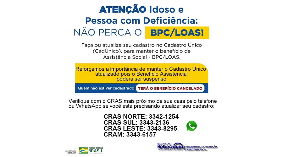 A Prefeitura de Bebedouro, por meio do Departamento de Promoção e Assistência Social, informa que está atualizando o Cadastro Único (CadÚnico) para a manutenção dos benefícios de assistência social BPC/LOAS.