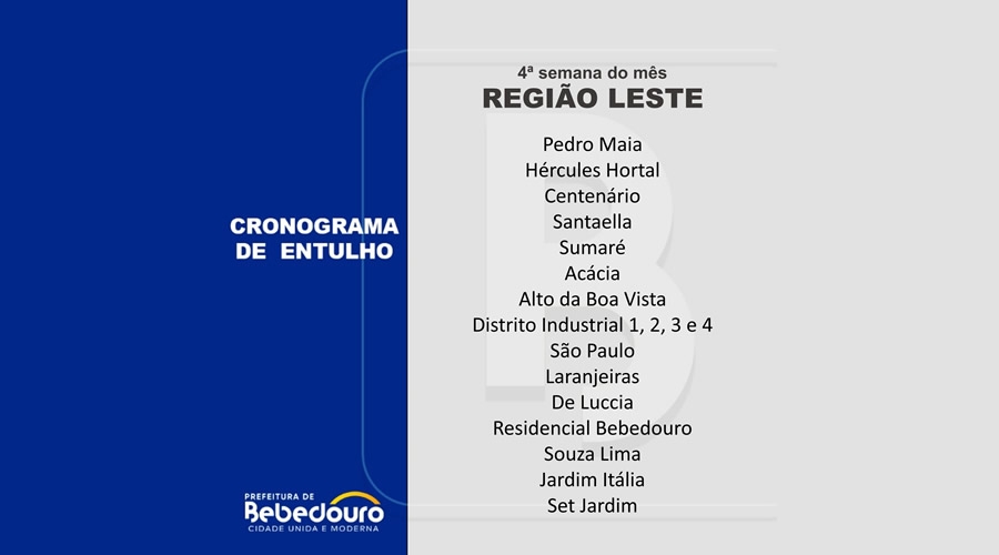 Os bairros Pedro Maia, Hércules Hortal, Centenário, Santaella, Sumaré, Acácia, Alto da Boa Vista, Distrito Industrial 1, 2, 3 e 4, São Paulo, Laranjeiras, De Luccia, Residencial Bebedouro, Souza Lima, Jardim Itália e Set Jardim, serão contemplados.