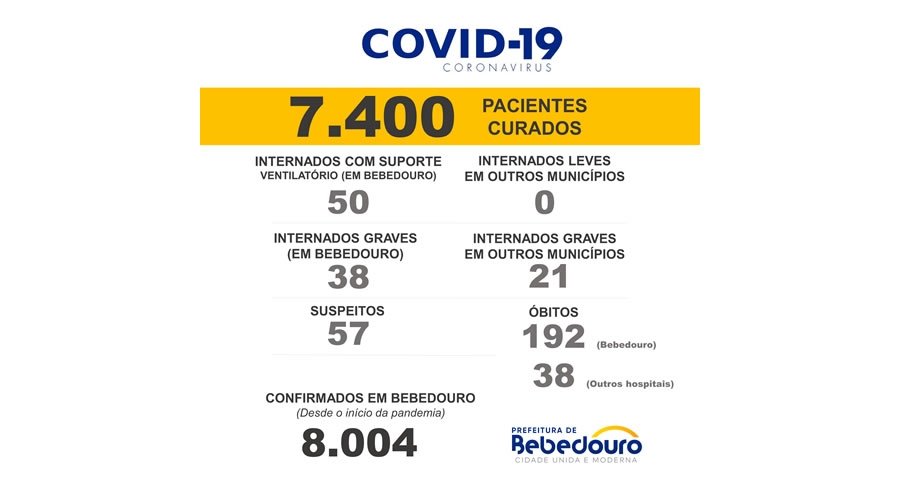 A Prefeitura de Bebedouro informa que foram confirmados 33 curados, 174 negativos e 121 casos positivos nesta terça-feira (01).