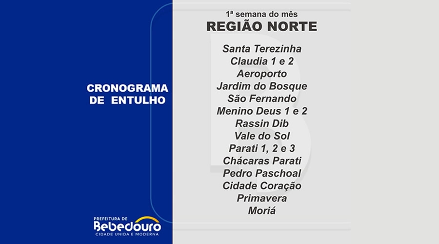 Os bairros Santa Terezinha, Claudia 1 e 2, Aeroporto, Jardim do Bosque, São Fernando, Menino Deus 1 e 2, Rassin Dib, Vale do Sol, Parati 1, 2 e 3, Chácaras Parati, Pedro Paschoal e Cidade Coração, Primavera e Moriá, serão contemplados.