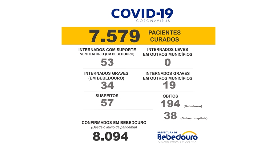 A Prefeitura de Bebedouro informa que foram confirmados 179 curados, 378 negativos e 90 casos positivos nesta quarta-feira (02).