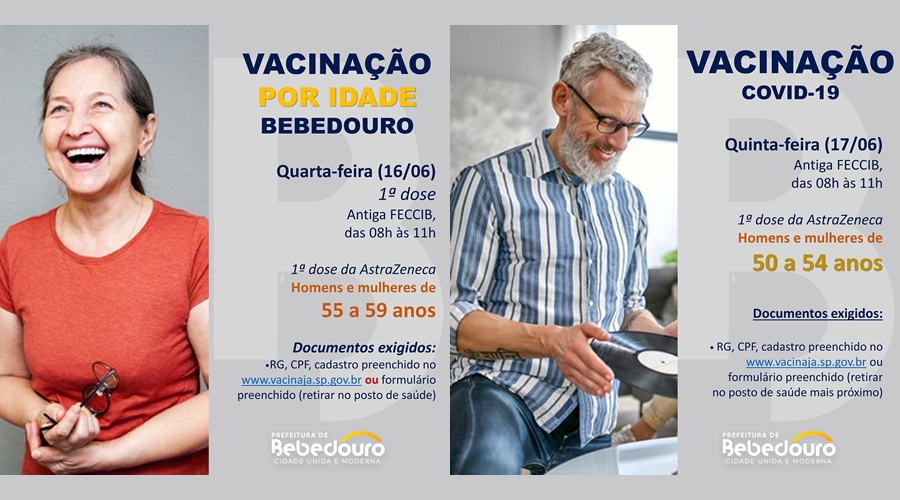 A vacinação por idade avança em Bebedouro e já atinge o segundo grupo. Pessoas de 50 a 54 anos serão imunizadas na próxima quinta-feira (17), das 08h às 11h, na antiga Feccib.