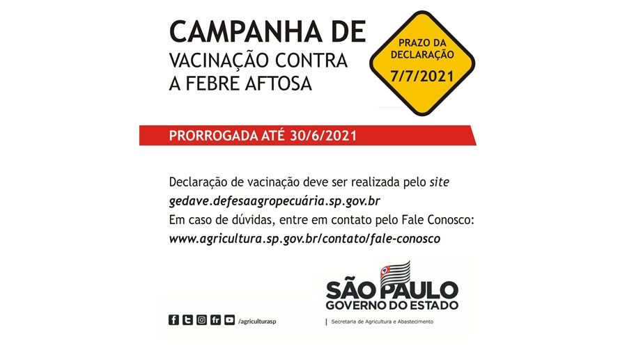 A Prefeitura de Bebedouro, por meio do Departamento Municipal de Agricultura, Abastecimento e Meio Ambiente, informa que os produtores de gado terão até às 17h30 desta quarta-feira (30) para imunizarem seus animais dentro da campanha contra a Febre Aftosa.