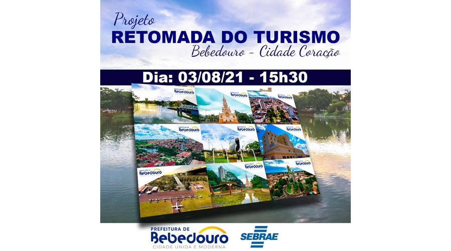 A Coordenadoria Municipal de Turismo, em parceria com o SEBRAE, apresenta o projeto “Retomada do Turismo – Bebedouro, Cidade Coração”, em uma reunião online que acontece na terça-feira, 03 de agosto, às 15h30. A participação é gratuita e os interessados podem se inscrever pelo link https://forms.gle/QyJcRGqX7ejipvcY6