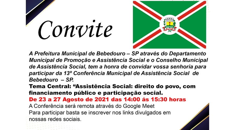 O Departamento de Promoção e Assistência Social (DMPAS) e o Conselho Municipal de Assistência Social (CMAS) realizam a 13ª edição da Conferência da Assistência Social de 23 a 27 de agosto, das 14h às 15h30, via Google Meet.