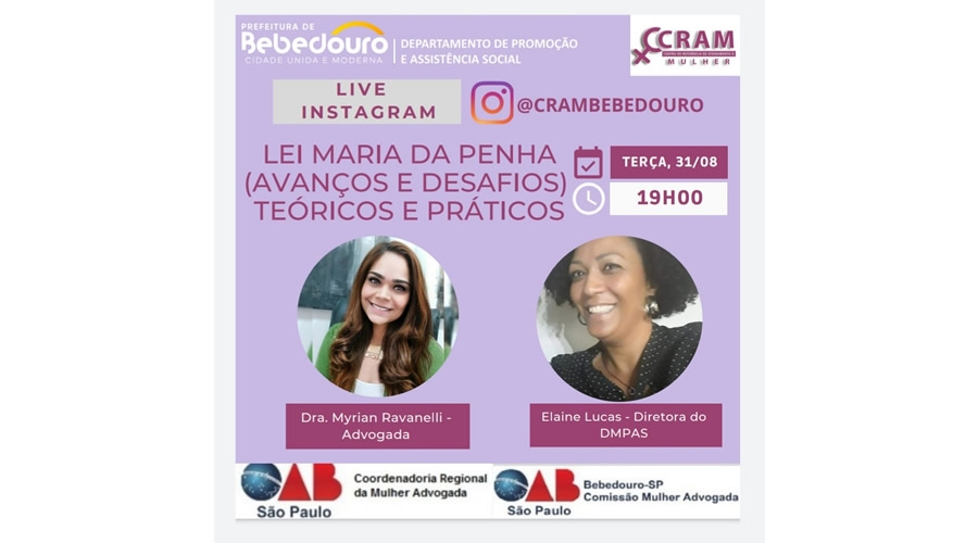 O evento estará disponível em uma live no Instagram @crambebedouro, às 19h, e conta com a participação da presidente da Comissão da Mulher, a advogada da OAB SP Myriam Ravanelli. “Bebedouro possui um histórico positivo no combate a violência. Temos profissionais qualificados, um Centro de Referência de Atendimento à Mulher – CRAM e, em breve, vamos implantar a Ronda da Mulher e a Casa da Mulher. Reunimos especialistas durante toda a semana e discutimos os desafios e como acolher e alertar a população”, diz a diretora do Departamento de Promoção e Assistência Social, Elaine Lucas.