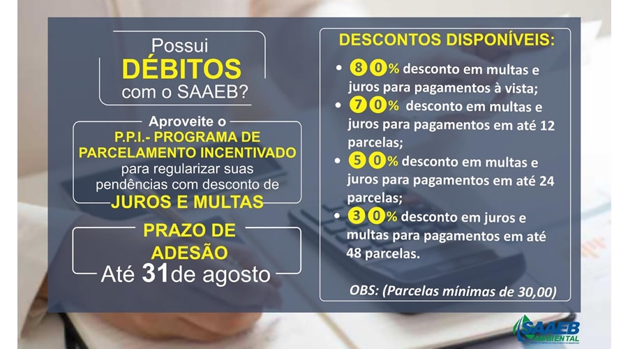 Quem possui dívidas com o Serviço Autônomo de Água e Esgoto Ambiental (SAAEB) tem até esta terça-feira (31) para resolver sua situação e garantir 80% de desconto em juros e multas nos pagamentos à vista.