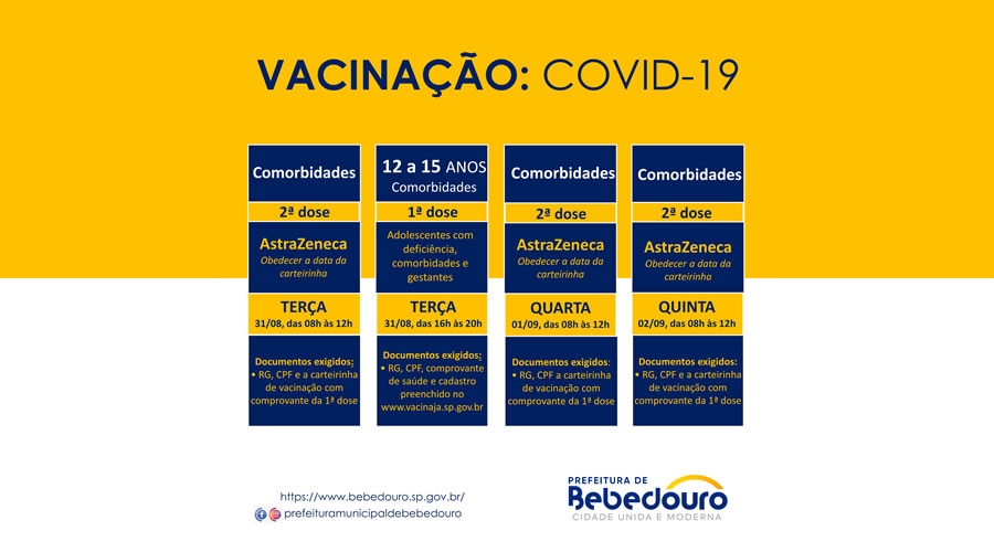 As pessoas com diferentes comorbidades e idades que foram imunizadas com a AstraZeneca recebem a 2ª dose durante a semana, na antiga Feccib, das 08h às 12h. É necessário obedecer a data de cada carteirinha. Já os adolescentes de 12 a 15 anos, com comorbidades, serão imunizados na terça-feira, das 16h às 20h.