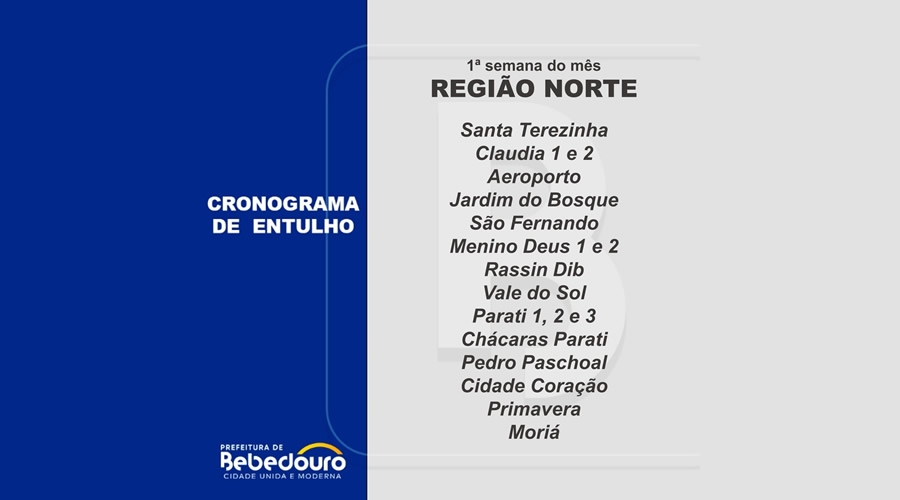 Os bairros Santa Terezinha, Claudia 1 e 2, Aeroporto, Jardim do Bosque, São Fernando, Menino Deus 1 e 2, Rassin Dib, Vale do Sol, Parati 1, 2 e 3, Chácaras Parati, Pedro Paschoal e Cidade Coração, Primavera e Moriá, serão contemplados.