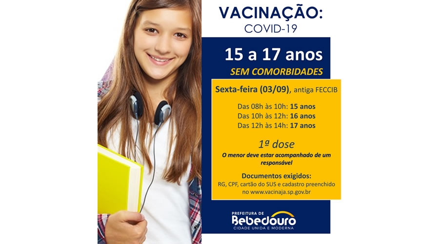 As vacinas da Pfizer para adolescentes de 15, 16 e 17 anos já chegaram em Bebedouro. Os jovens serão vacinados nesta sexta-feira (03), das 08h às 14h, na antiga Feccib. Confira os horários de cada faixa etária no cronograma.