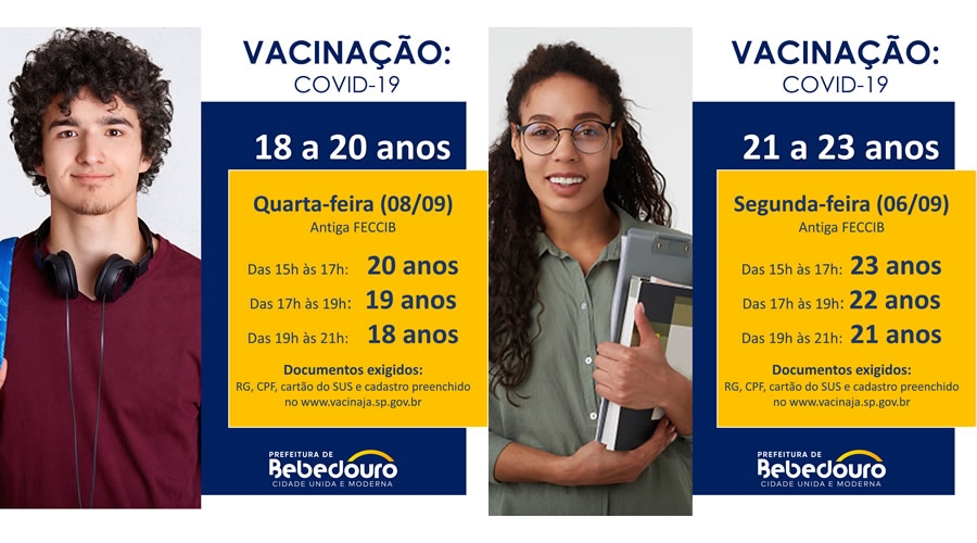 A Secretaria Municipal de Saúde preparou dois grandes mutirões para concluir a vacinação dos adultos. A equipe do Departamento de Vigilância Epidemiológica criou horários específicos para cada faixa etária (ver abaixo). Pessoas de 23, 22 e 21 anos serão imunizados na segunda-feira (06) e as de 20, 19 e 18 anos na quarta-feira (08).